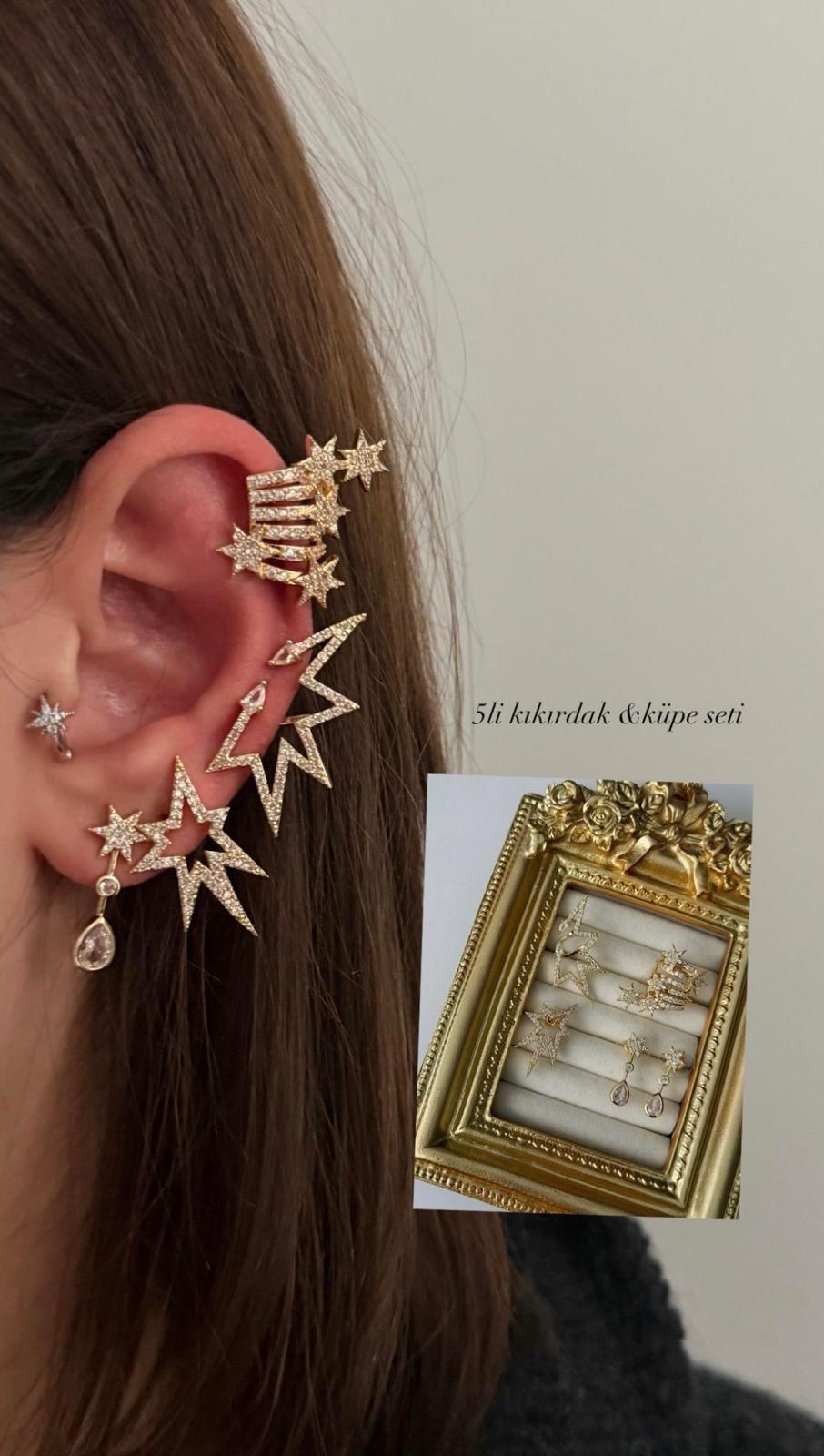 – Işıltılı & Modern Tasarım Yıldızlardan ilham alan bu 5’li küpe seti, kulağınızda bütünlüklü ve göz alıcı bir görünüm yaratmak için tasarlandı.